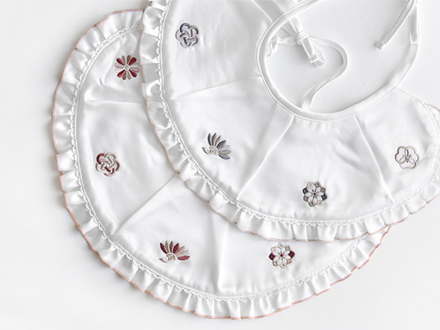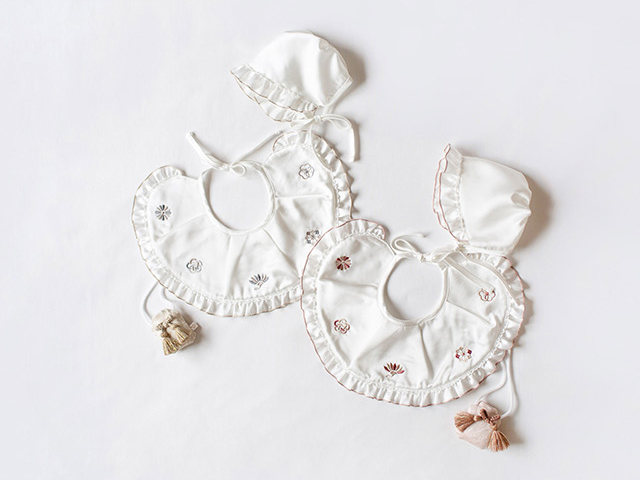 マットな光沢が美しい純白のスタイ&ボンネット。