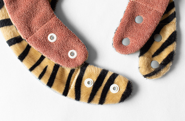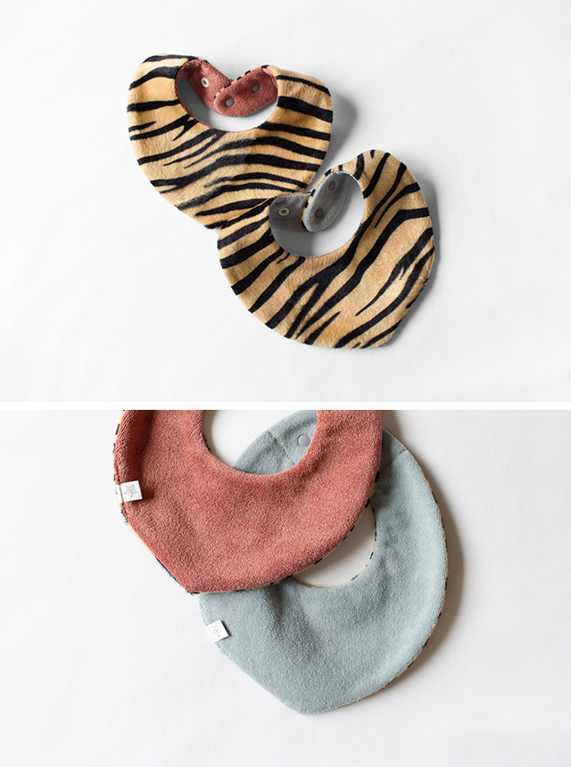 フェイクファーのような風合いで、滑らかに仕上げたスタイ。