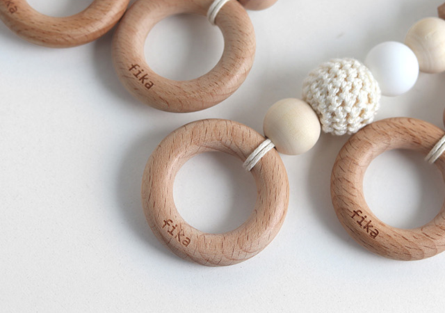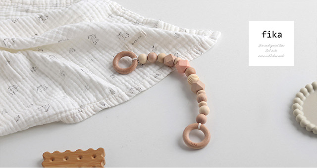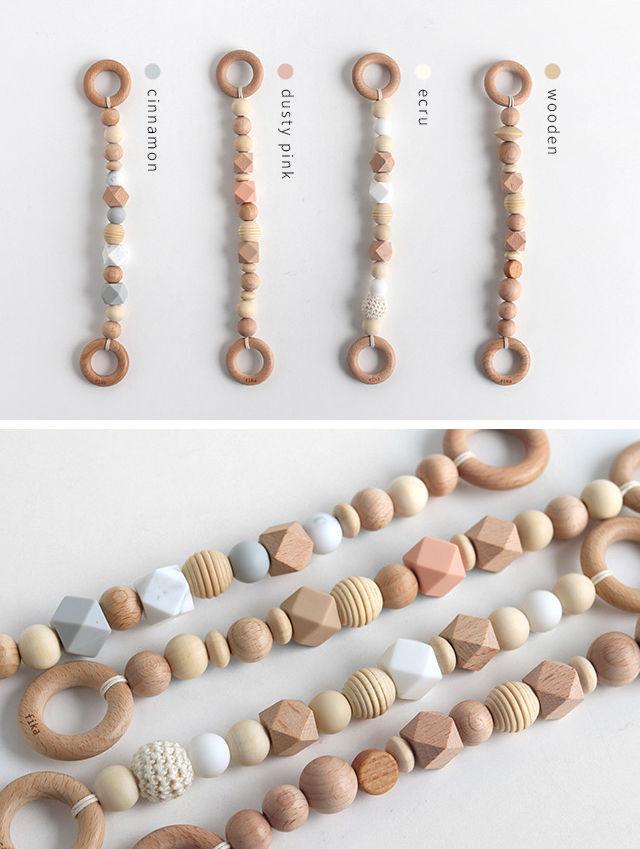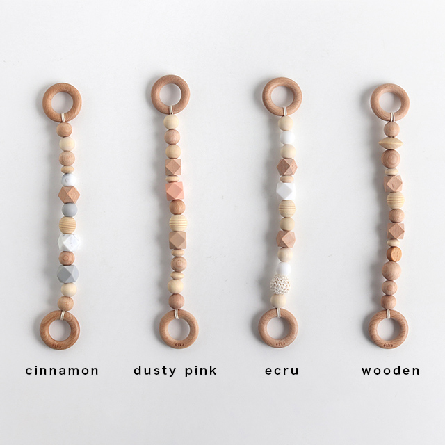 シナモン・ダスティピンク・エクリュは木とBPAフリーのシリコーンビーズをミックス。