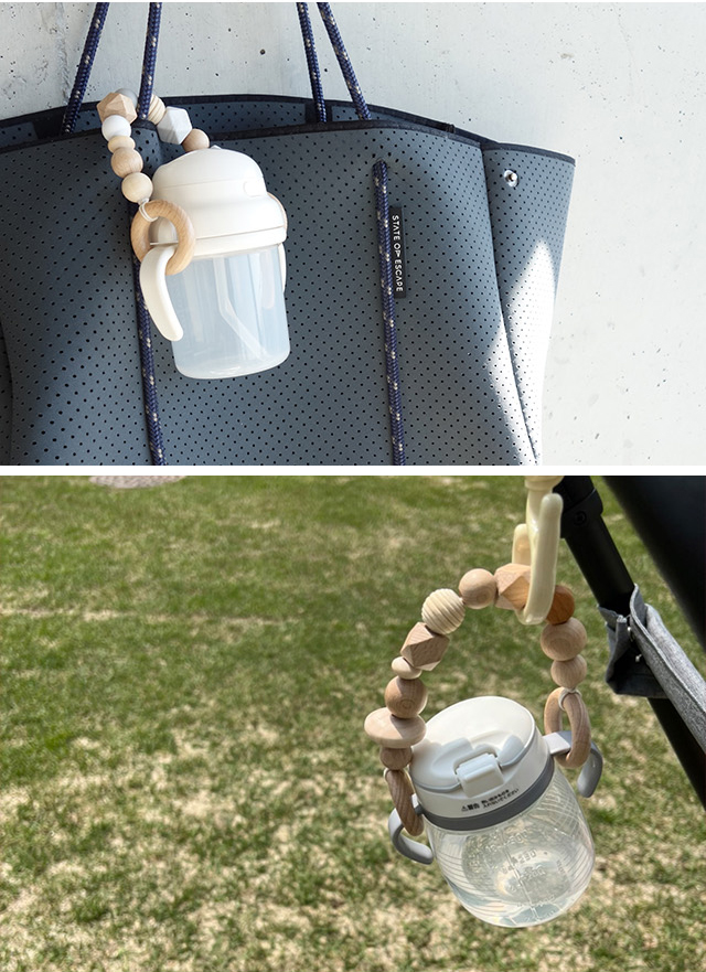 本品をバッグやベビーカーに引っ掛け、マグの持ち手にリングを通せばOK!
