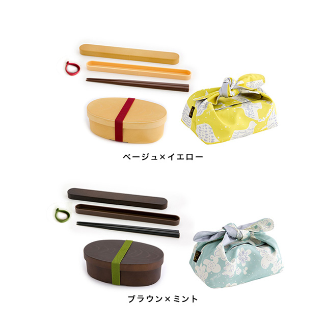 ベージュのわっぱにはイエローカラーの袋、ブラウンのわっぱにはミントカラーの袋がセットになっています。