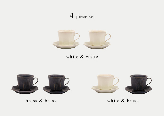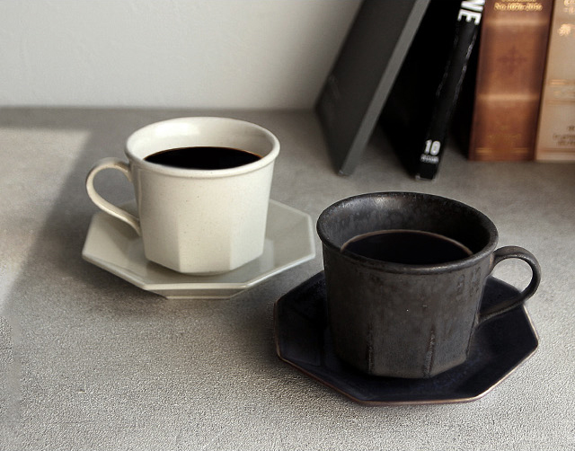 口元はフラット、ボトムは八角形のカップに、縁が反り立ったデザインのソーサー。