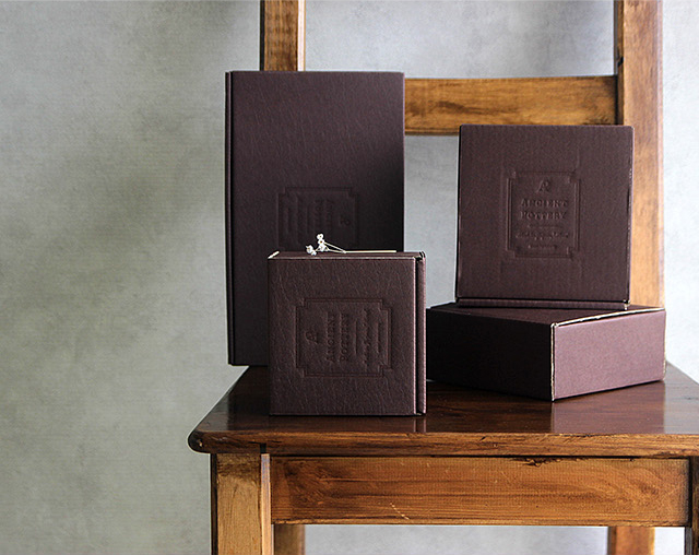 レザー調のブラウンカラーのBOXは、手に取るだけで高級感が伝わり、ブランドロゴの押印が洗練された印象に。