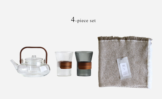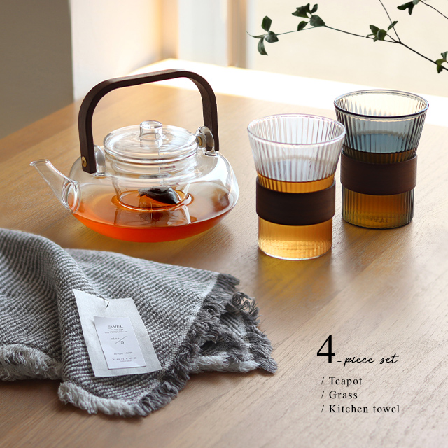 ティーポット・カップ:ホウケイ酸ガラス(耐熱ガラス)、ウォルナット(ラッカー仕上げ) タオル:綿100%