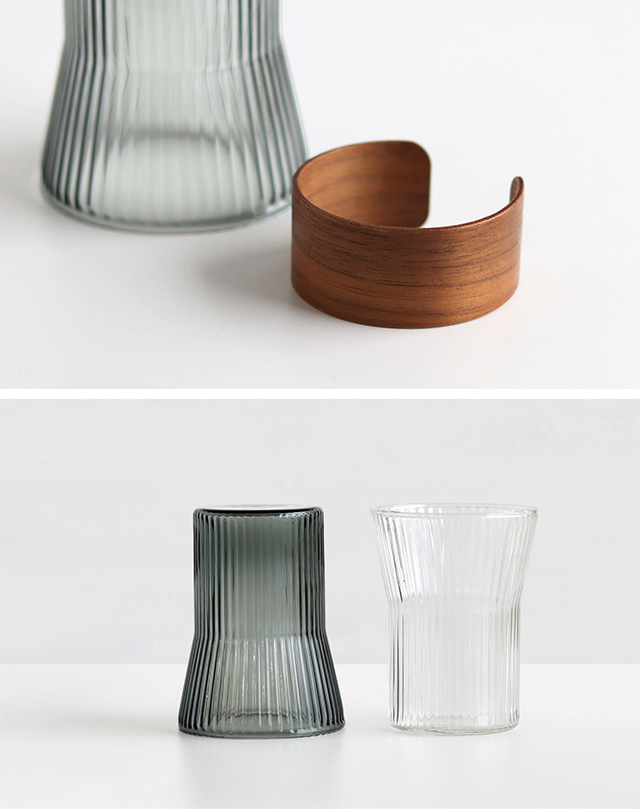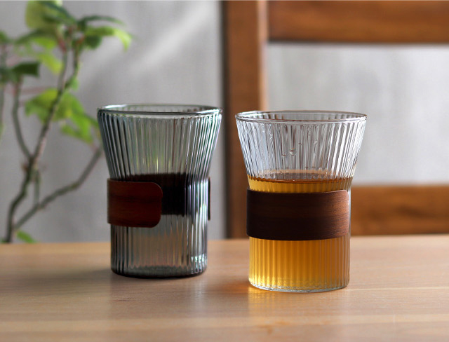 美しいウォルナットの木目と、細かくリブが施されキラキラと光るガラスカップの調和をお楽しみ下さい。
