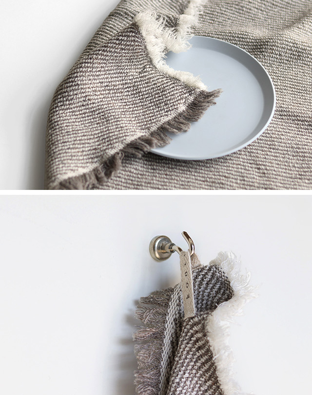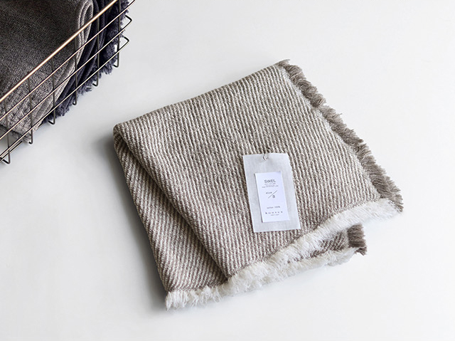 波のうねりをイメージした斜向ストライプ模様に、さりげない2色のショートフリンジがアクセントを添えます。