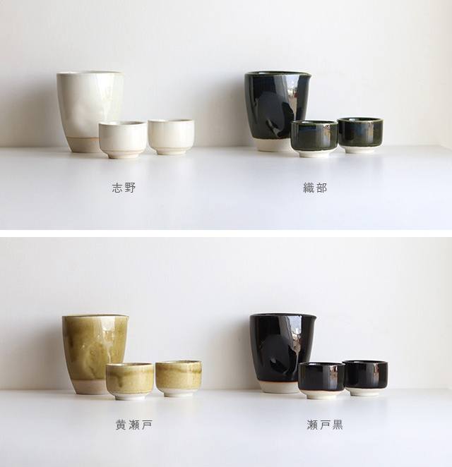 カラーは4種類。とろけるような自然な白色の"志野"・深い緑色の味わいが渋い"織部"・あたたかい黄味を帯びた"黄瀬戸"・黒く艶やかな"瀬戸黒"からお選びいただけます。