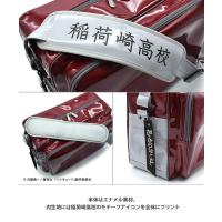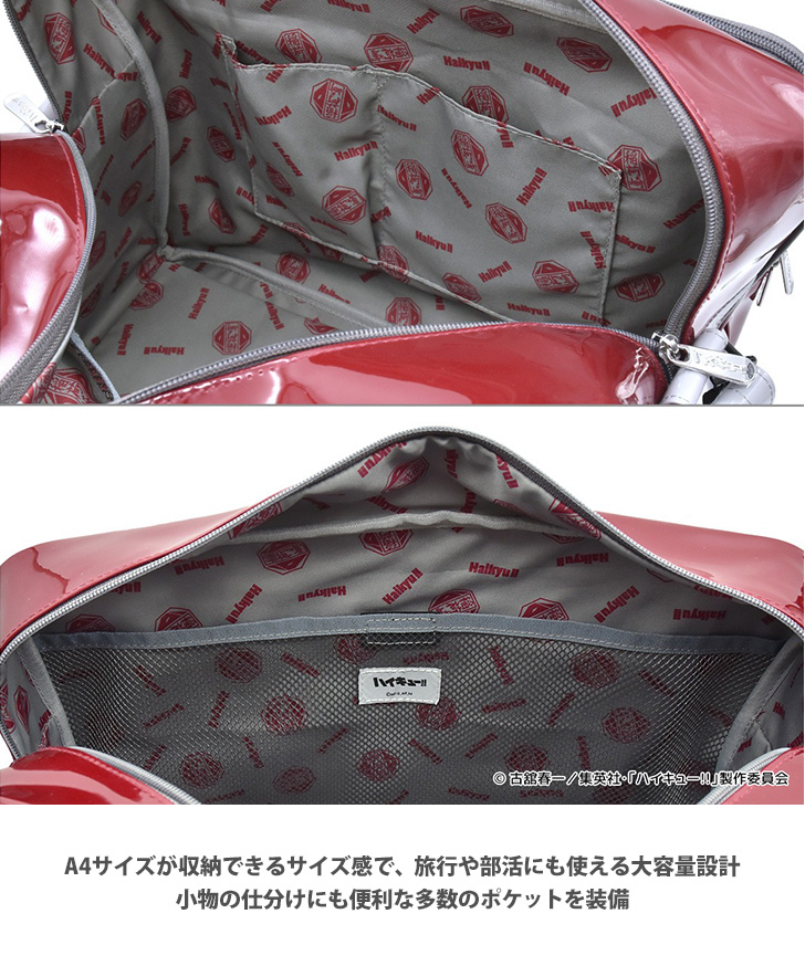 本体はエナメル素材、内生地には稲荷崎高校のモチーフアイコンを全体にプリント。