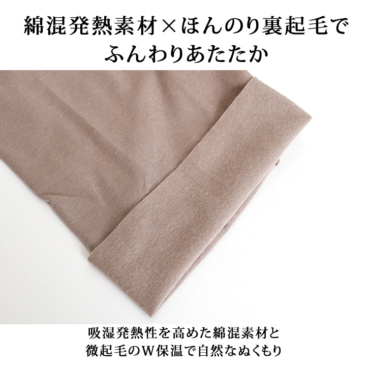 厚みを抑えた裏起毛仕様で肌触りがやわらかく、腹巻き部分は二重構造で冷え対策もばっちり。