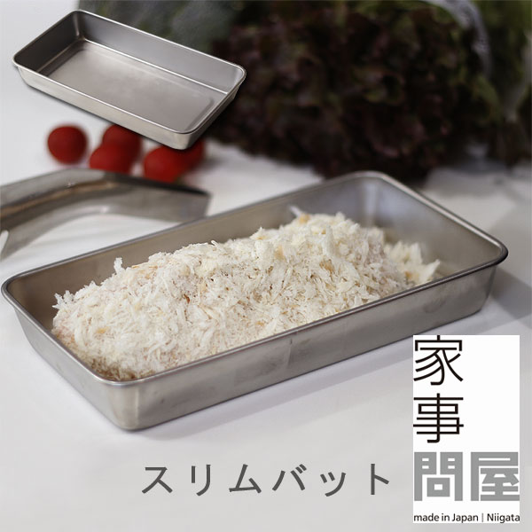 とんかつ1枚が丁度よいスリムサイズのバットで、小麦粉・パン粉などを少量で無駄なく使えます。