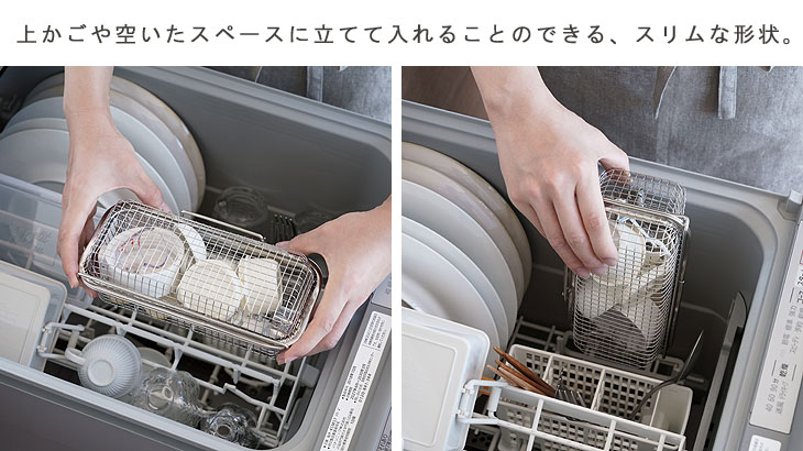 食洗機の上かごや空いたスペースに立てて入れることのできる、スリムな形状です。