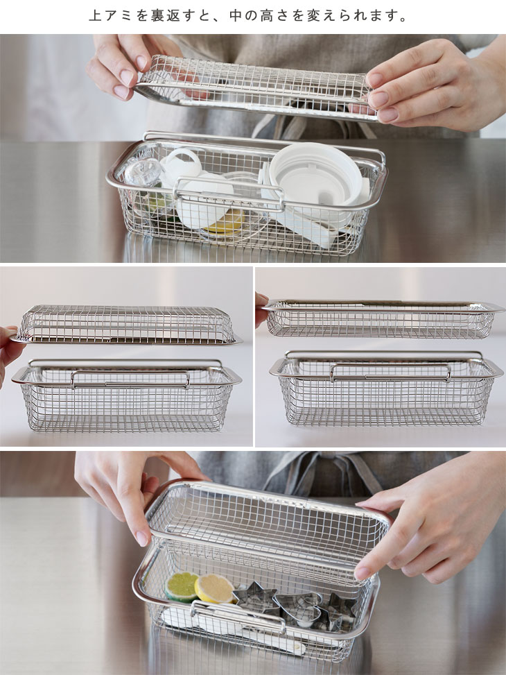 上アミを裏返すと中の高さを変えられ、箸置きやカトラリー類など、背の低い小物類も動きにくくなります。