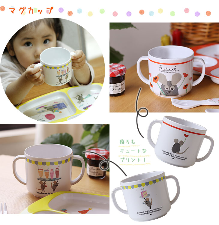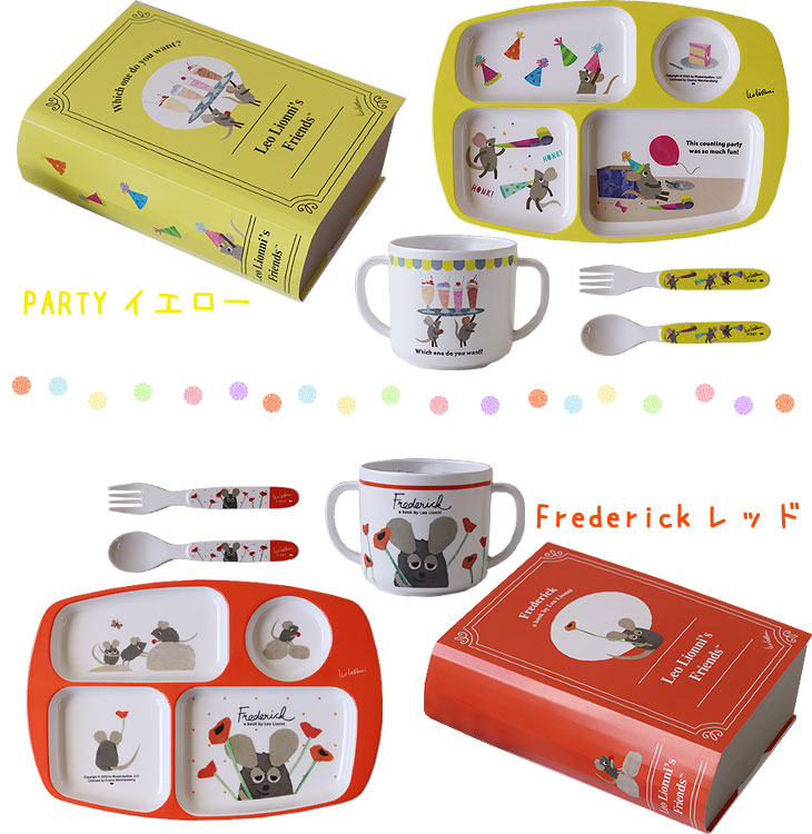 「スイミー」など子供から大人まで楽しめる絵本を数多く生み出してきた『レオ・レオニ』の作品がキュートなメラミン製のお子さま食器セットに♪まるで絵本から飛び出したような色彩の食器は、見ているだけでハッピー! プレート・マグカップ・スプーン・フォークを絵本風パッケージにセットしてお届け。切り絵で表現された野ねずみのおはなしを食卓でも楽しめちゃいます。毎日がお子様ランチのような特別感! お子様とかわいく盛り付けて笑顔いっぱいのお食事タイムをどうぞ♪