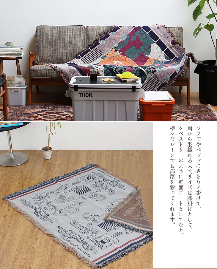 ソファやベッドにサラッと掛けて、膝掛けとして、鮮やかな色合いをいかしてアートとして壁面への装飾として斬新な使い方など様々にお部屋を彩ります。