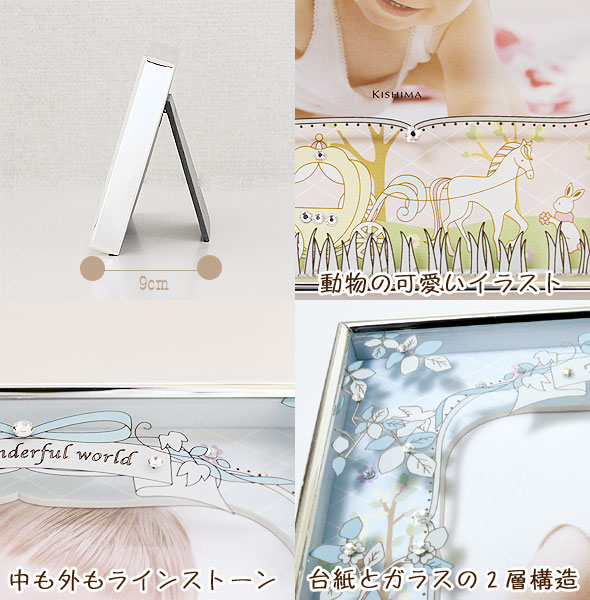 絵本に出てくるような、森の動物たちがたくさんいて可愛い、フォトフレーム。ラインストーンの付いたペーパーマットと、イラストが付いたガラスの2重構造。ラインストーンがキラキラとちりばめられ、朝露のしずくのように輝いています。お気に入りの写真を1枚飾れます。ギフトボックス付きでギフトにもオススメです。