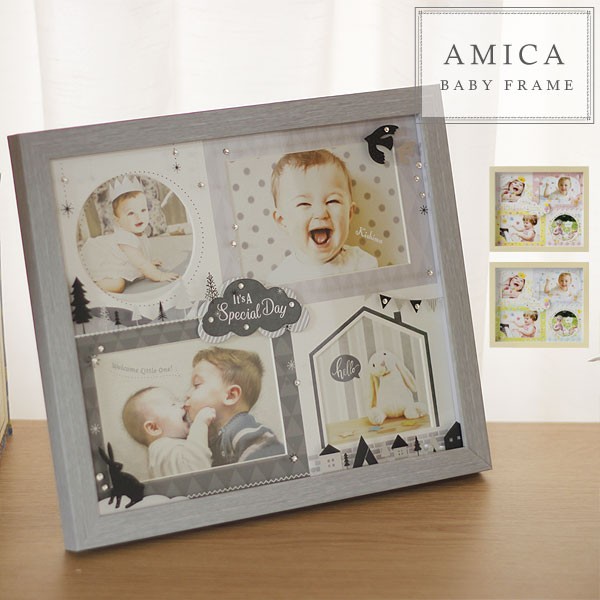 賑やかで可愛らしいイラストがふんだんに散りばめられた楽しい多窓フォトフレーム、「アミカ ベビーフレーム」。