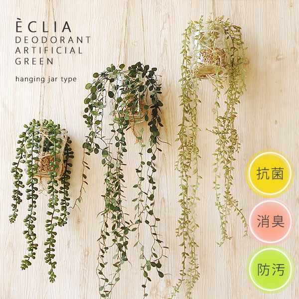 本物そっくりなフェイクグリーン。実はこれ、飾っておくだけで抗菌、防汚、消臭効果も発揮してくれる優秀アイテムなんです♪葉の表面にCT触媒加工という特殊な加工が施されており、光や水を一切必要としません。また、特別なメンテナンス要らずで、その効果は半永久的に持続します。生活感がなく、美しい空気を作りながらインテリアを楽しめます。ナチュラルなマクラメ付きのハンギングタイプで、ガラス瓶からボリュームたっぷりのグリーンが垂れている様子が可愛い♪