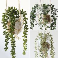 ナチュラルなマクラメ付きのハンギングタイプ。ガラス瓶からボリュームたっぷりのグリーンが垂れている様子が可愛い♪