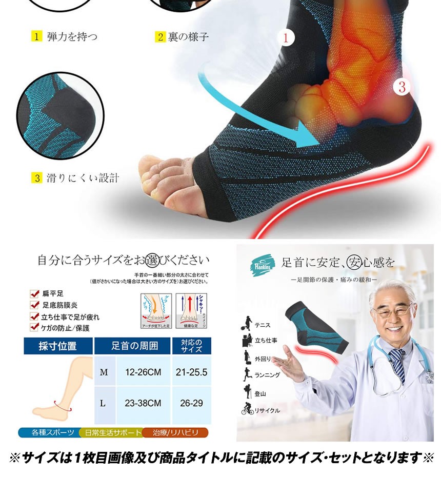 足首の太さ:M(12-26cm)、 L(23-38cm) 、足首の一番細い部分の(値がさかいになった場合は大きい方のサイズを)お選びください。対応靴のサイズ:M(21-25.5cm)、 L(26-29cm) ※2サイズに該当する場合は、大きい方のサイズをおすすめします。