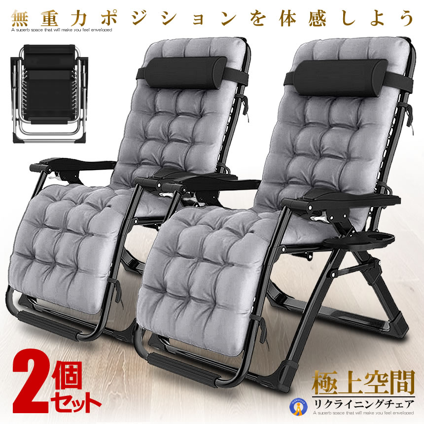 2個セット リクライニング チェア VIP型 グレー クッション 折りたたみチェア 枕つき リビング 金属ロック 角度調節 耐荷重200kg RIKUCHAI-A-GY