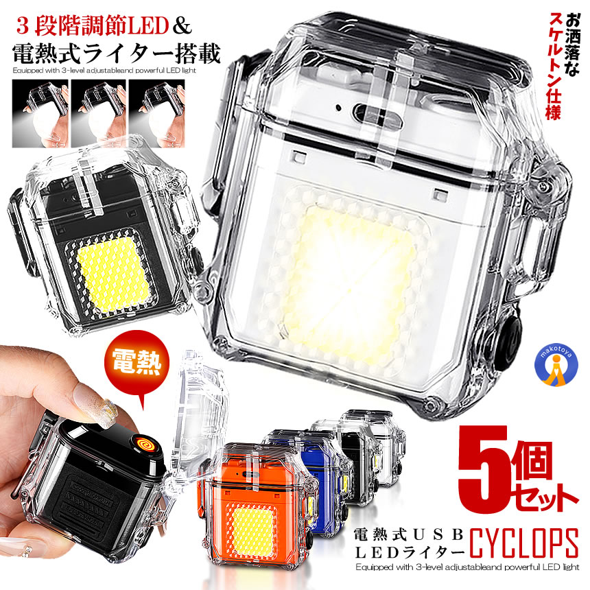 5個セット 電熱式 ライト付き ライター COB 照明 懐中電灯 3段階光モード ポケット 防水 作業灯 読書灯 COBRAIRAI