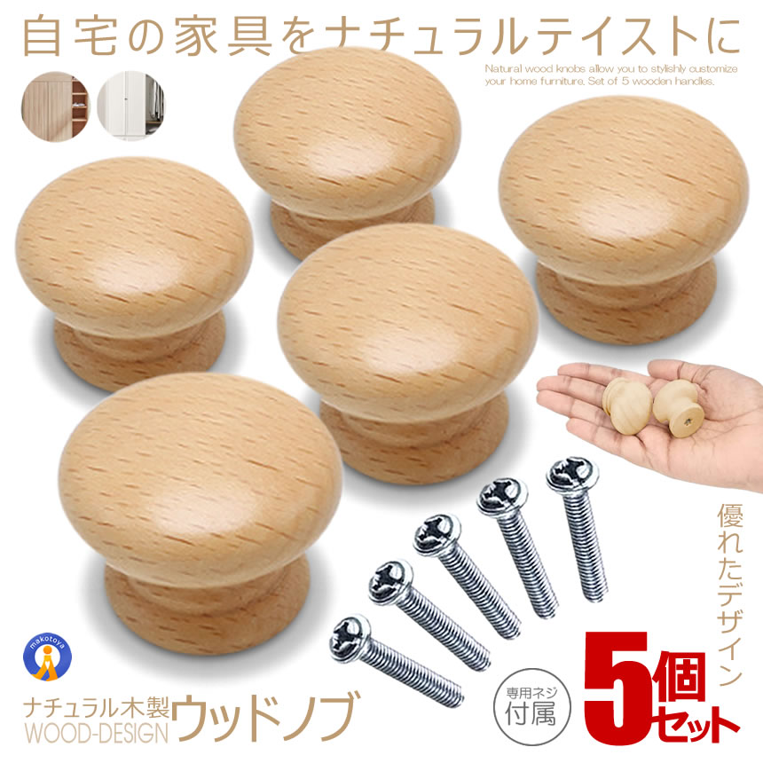 木製 ノブ 取っ手 つまみ 5個セット 丸型 ナチュラル 自然 インテリア 引き出し家具 5-TOTTE