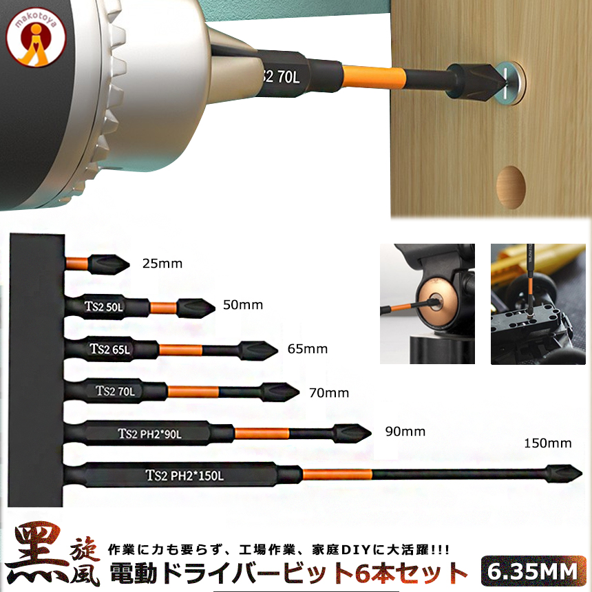 【商品説明】♪6本組 ビットセット♪・プロ用マルチサイズ:25mmから150mmまで汎用性の高いサイズをご用意!※ネジのサイズが異なると、ドライバーやネジが破損することがあります。 正しいドライバービットを使えば、より少ない力で簡単にネジを外すことができます。=============【商品仕様】材料:S2 合金鋼軸径:6.35mm六角軸 (1/4インチ)サイズ:25mm/50mm/65mm/70mm/90mm/150mm※日本語説明書は付属しておりません。※モニターにより色合いが若干前後する場合がございます。※輸入品ですので多少の臭いやスレ傷、汚れはご了承ください。※サイズは実寸ですが若干前後する場合がございます。