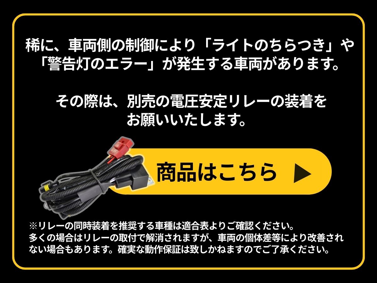 | 最新、その他車種情報は>適合表<をご確認ください。 ご購入前には、必ず現車にて装着されているバルブ形状と取付けスペースの確認をお願いいたします。 ・バルブ取付時は回しすぎにご注意ください。 ・作業スペースが狭い場合、バンパーを外しての作業となる場合があります。 ・T20トルクスネジが使われている場合があります。その場合は、お客さまにて必要な工具をご準備ください。 ・ヒートセンサーにより、温度上昇時はLEDが暗くなることがあります。 【車検について】 フロスティブルーとアンバーは車検非対応カラーです。 ライムイエローは車検基準を満たす黄色ですが、検査官の判断により不適合となる場合がございます。 検査時はホワイト or イエローに切り替えてください。 ※メモリー機能付きのため、車検を受ける前にホワイト、またはイエローで点灯するかご確認ください。 【取付不可車両】 24V車/輸入車/純正フォグランプユニット未装着車/純正バイカラーLEDフォグランプ装着車 車種・グレードによっては取付できません。必ず適合表をご確認ください。 特に下記の車種では購入間違いが増えておりますので、ご購入前に今一度ご確認をお願いいたします。 【ノア 90系】S-Z/S-Gグレード:フォグユニット タイプB / Zグレード、Xグレード(後期のみ):L1Bバルブ 【RAV4 50系】アドベンチャーグレード:フォグユニット タイプB / アドベンチャーグレード以外:L1Bバルブ ・車両側の制御システムの影響により、稀に「ちらつき」や「エラー表示」等の症状が発生する場合がございます。 万が一このような症状が出た場合は、電圧安定用リレー(別売)のお取り付けをお試しください。 リレーの追加で改善されるケースがほとんどですが、車両ごとの相性もあるため、すべての車両での改善を保証するものではございません。 弊社で把握している「リレーが必要な車種」は適合表に記載しておりますので、あわせてご確認をお願いいたします。 その他、保証規定、返品・交換、車検については>ご利用ガイド<をご確認ください。 |
