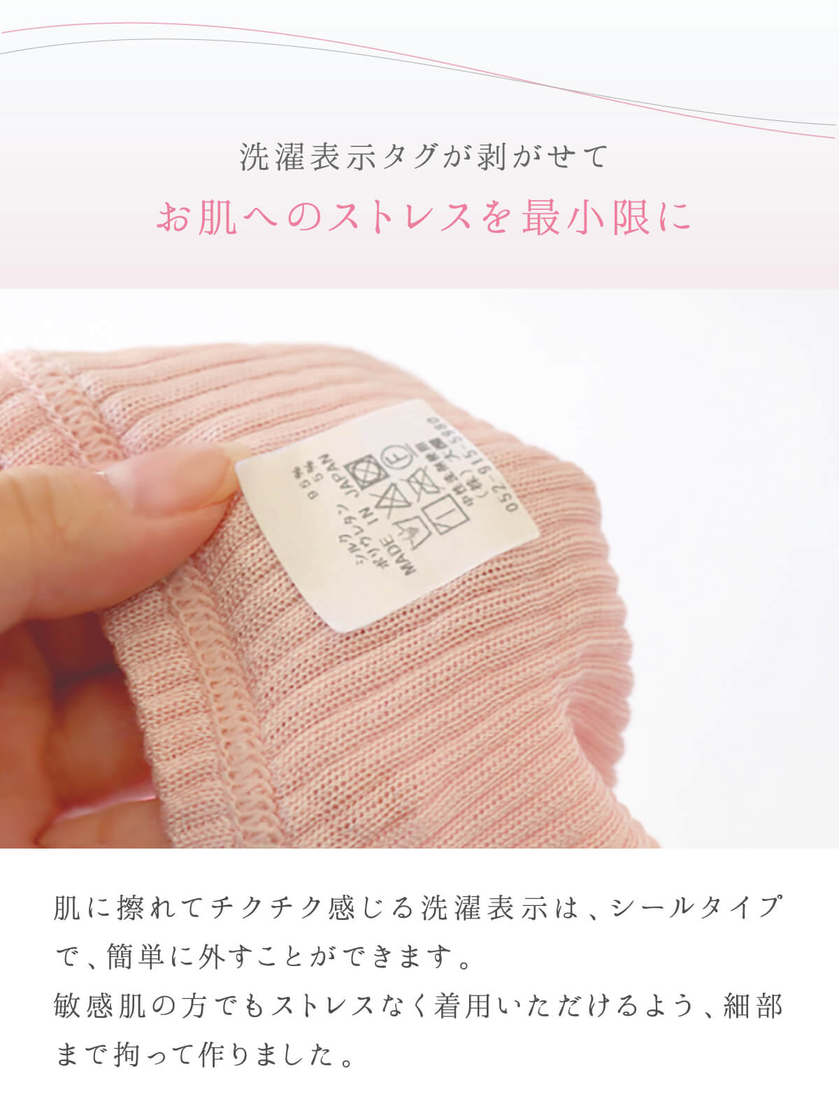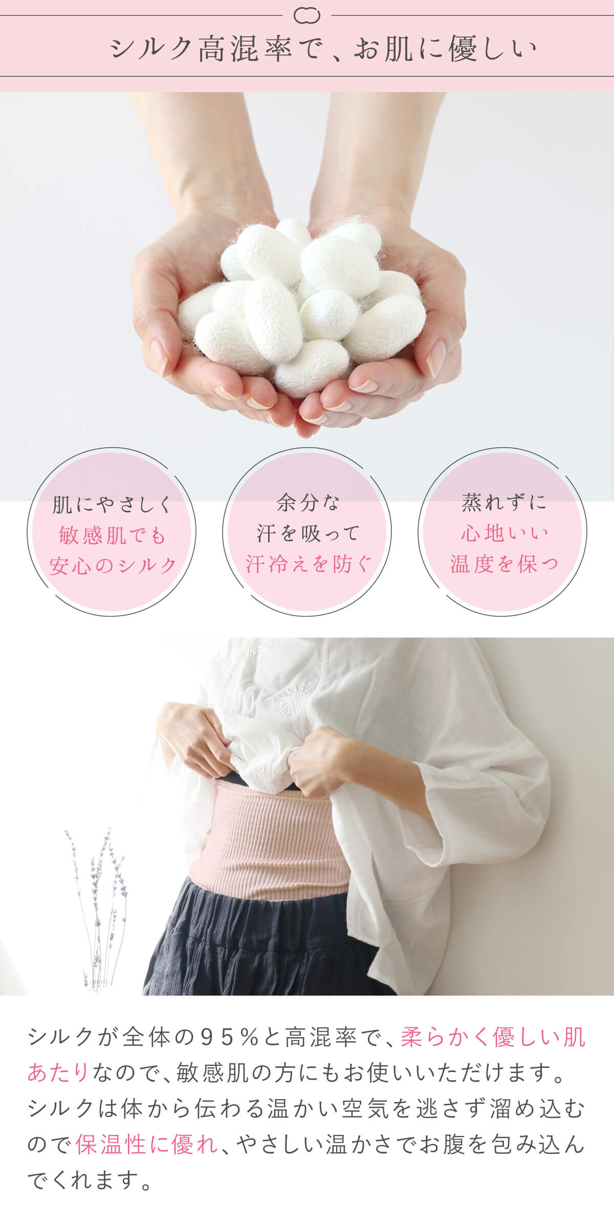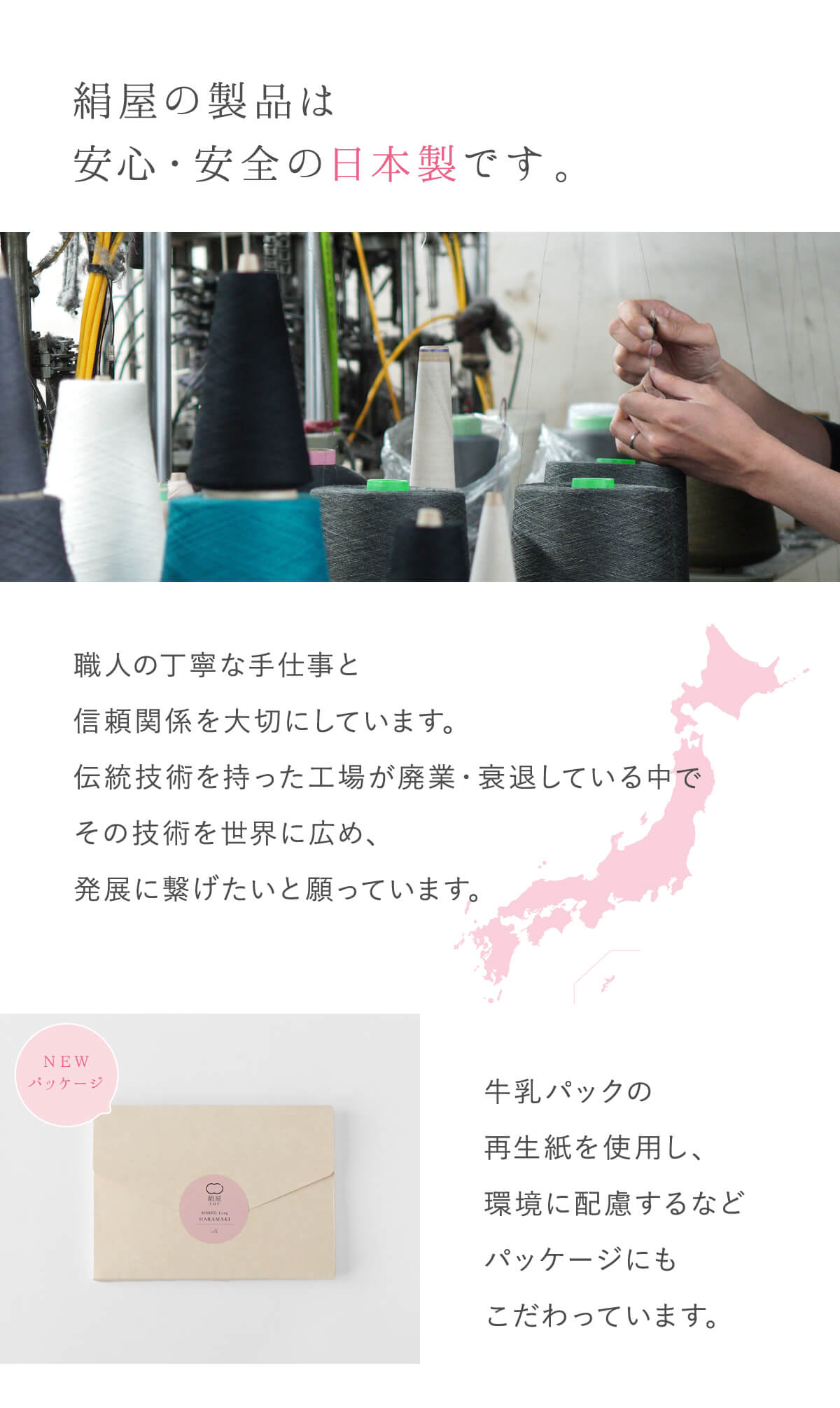 伸縮性を持たせるために、ゴムも編まれていますが、実際にはシルクのみが肌にあたるように作られています。繊細なお肌をシルクが優しく包みます。