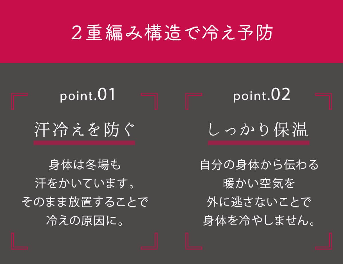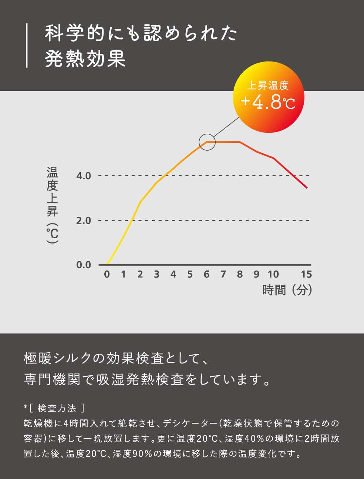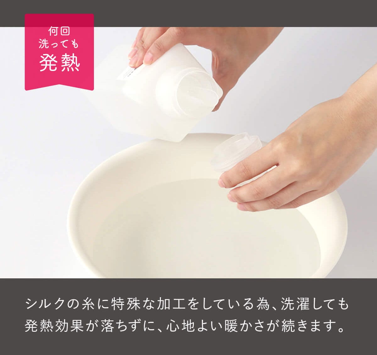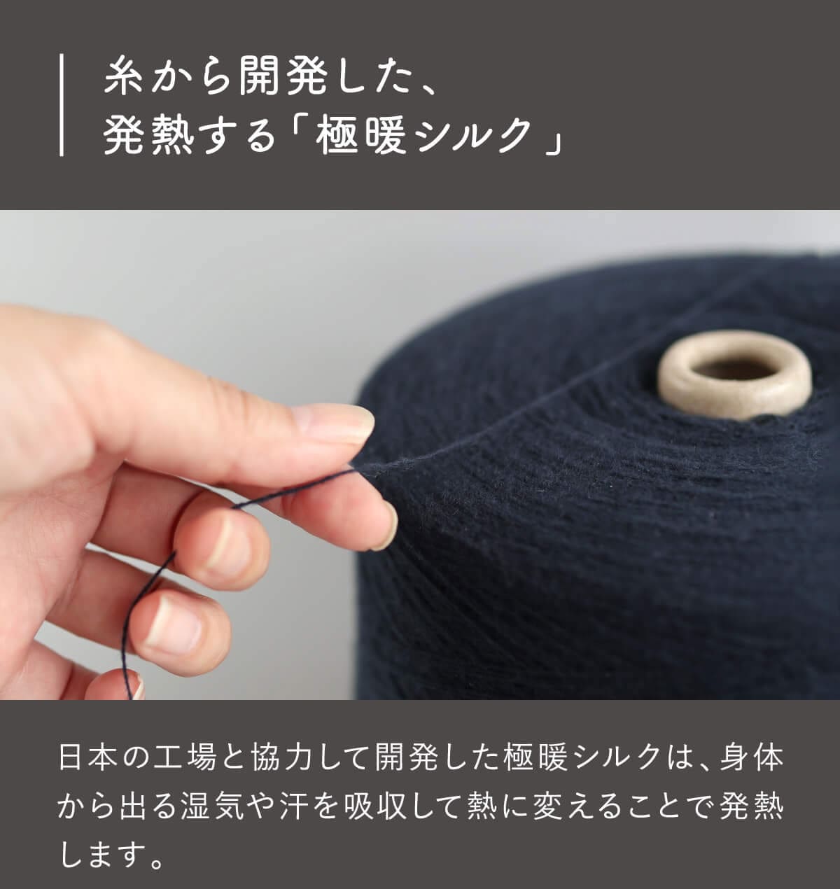 シルクの吸湿性で汗冷えを防ぎ、極暖シルクの発熱性と2重編みの保温力で薄手でもしっかりと温めます。滑らかな極暖シルクが心地よい肌触り。