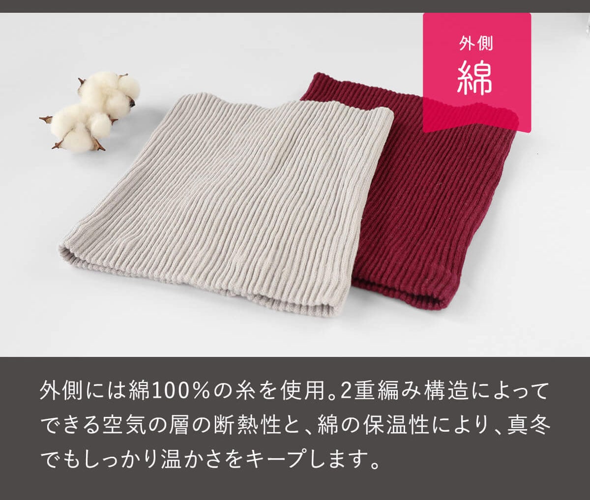 内側は発熱性の極暖シルク、外側は綿の2重編みネックウォーマー。
