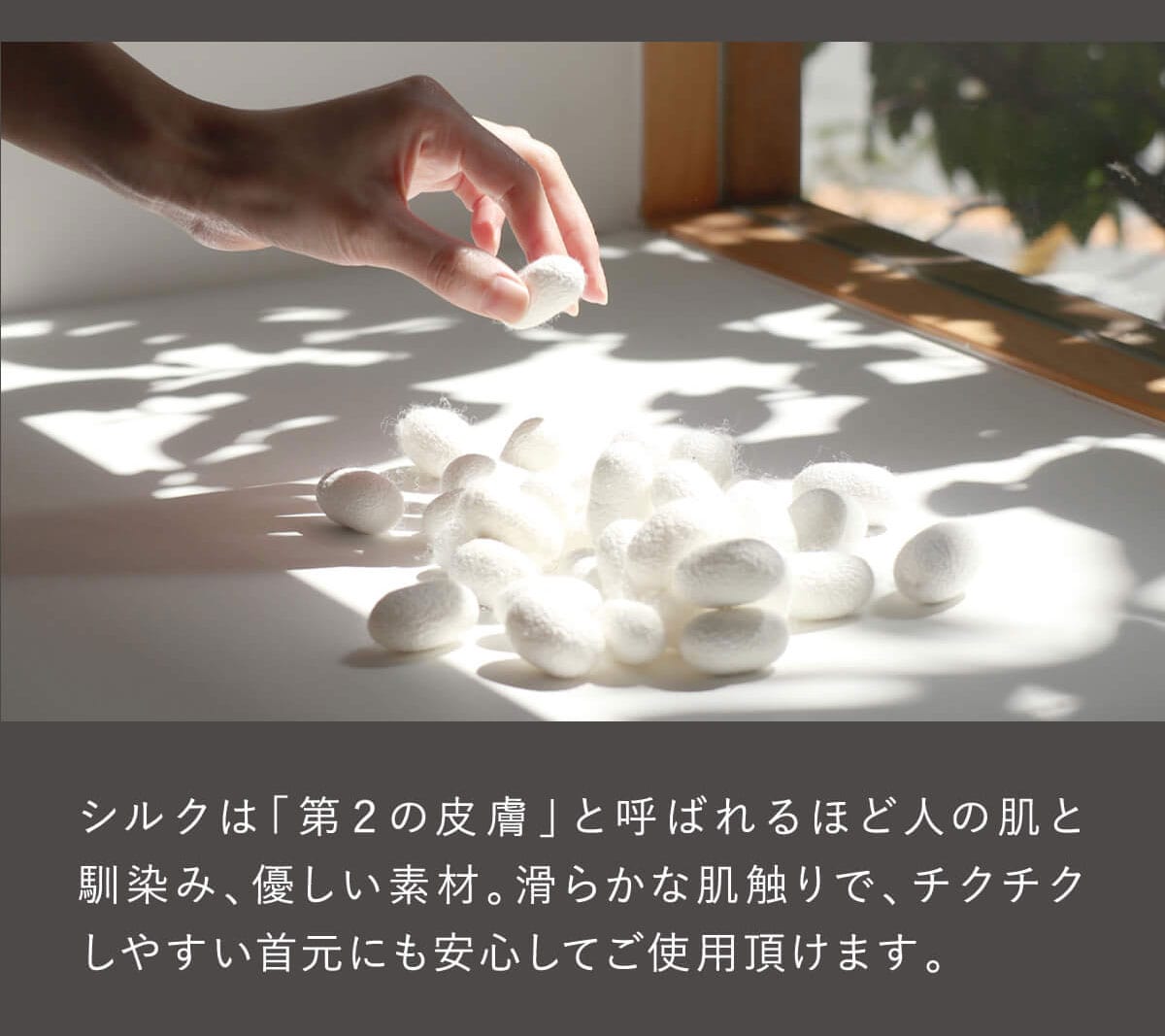 シルクの吸放質性は非常に高く、綿の約1.5倍。汗などの湿気をしっかり吸い取り、気化熱による冷えから身体を守ります。