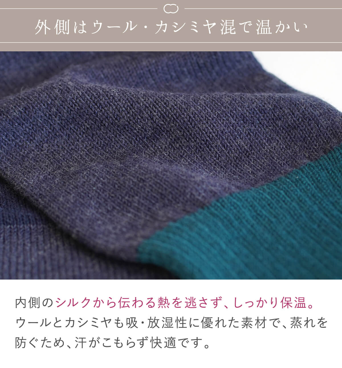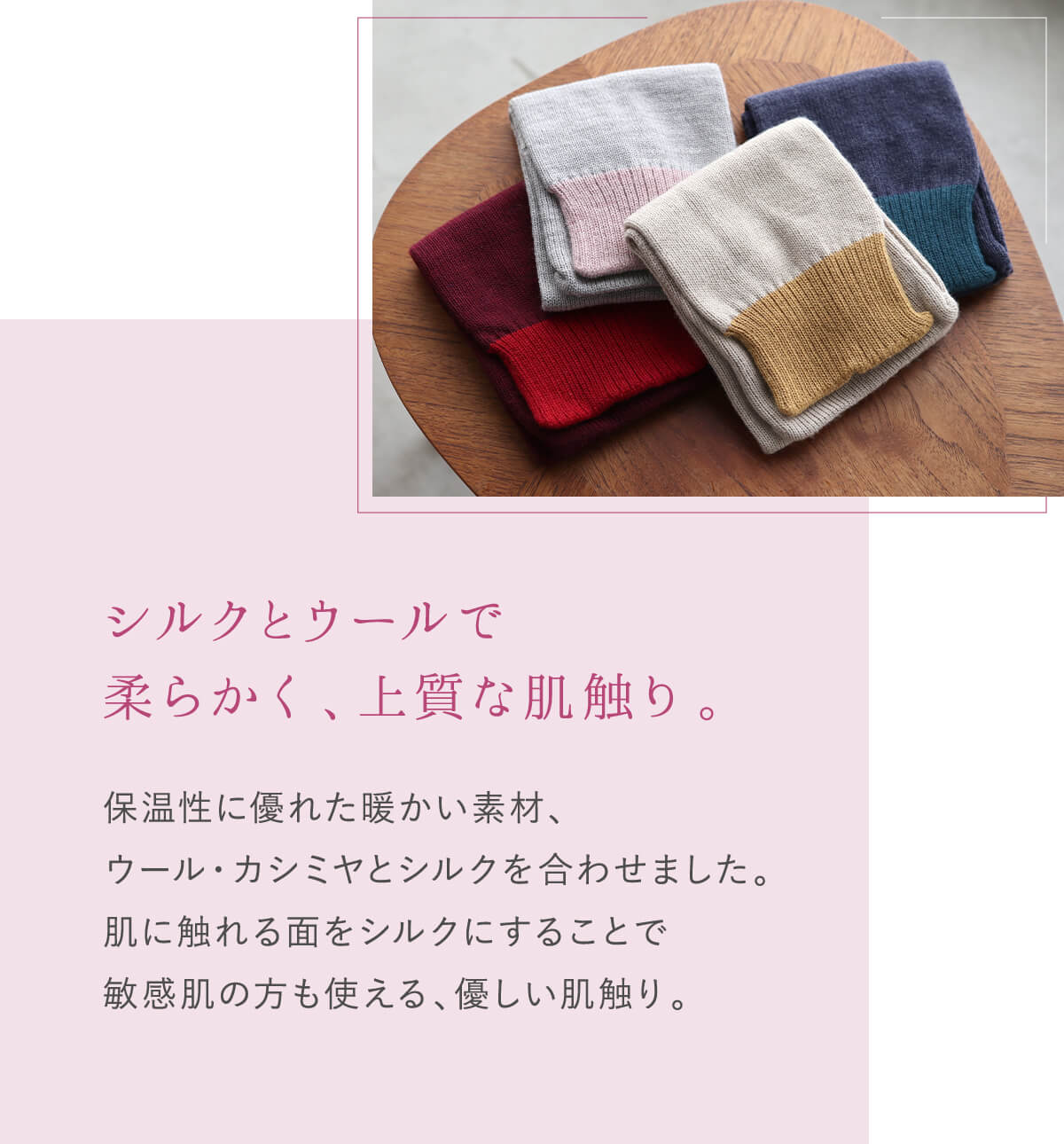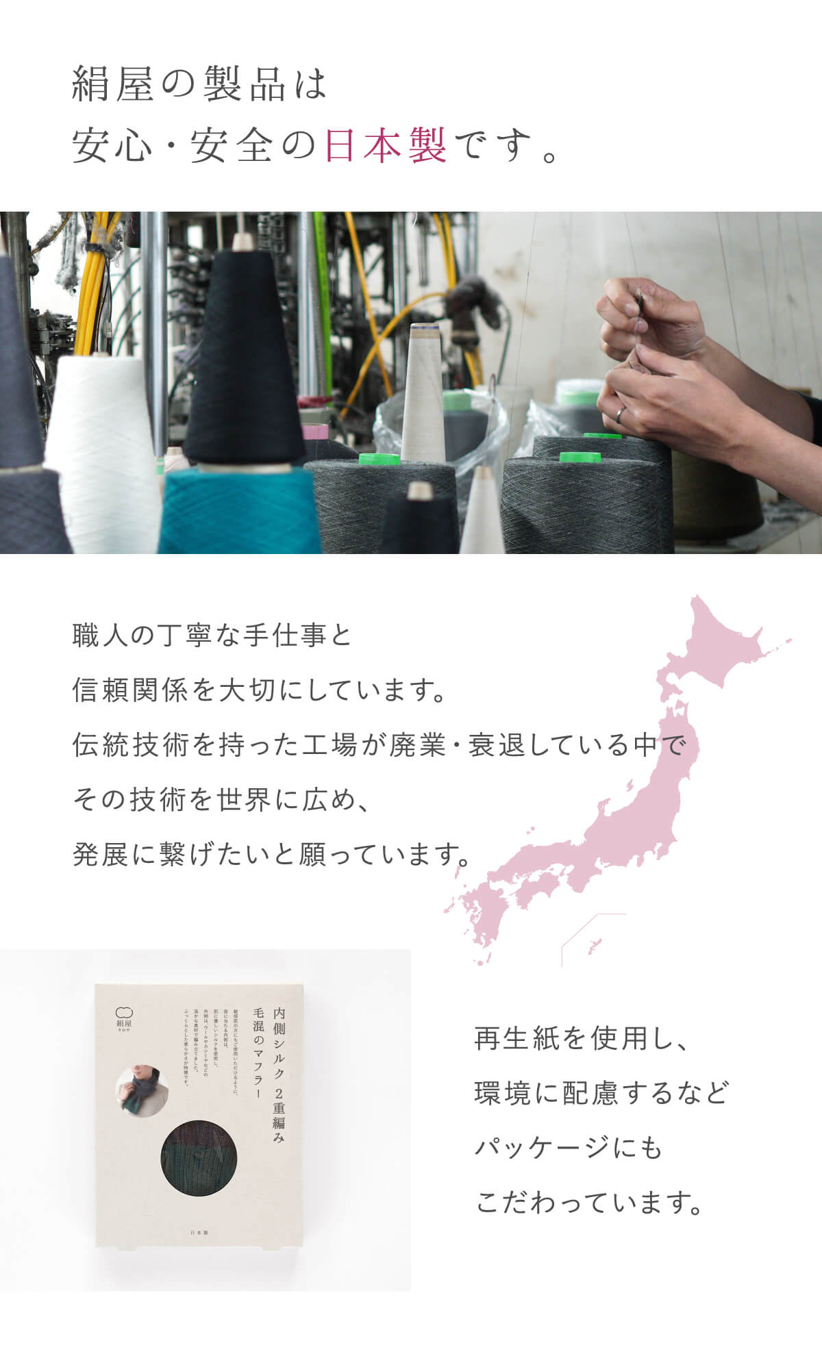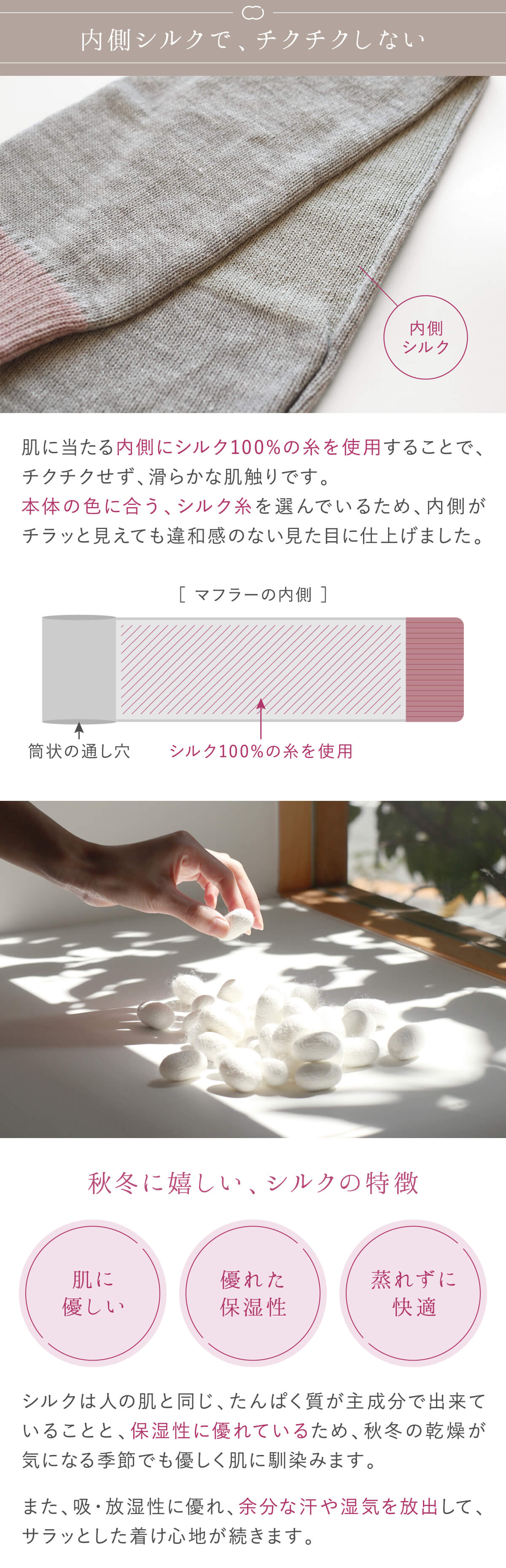 | 組成 | アクリル46%、シルク43%、ナイロン5%、羊毛5%、カシミヤ1% ※肌に当たる内側はシルク100%の糸を使用 |