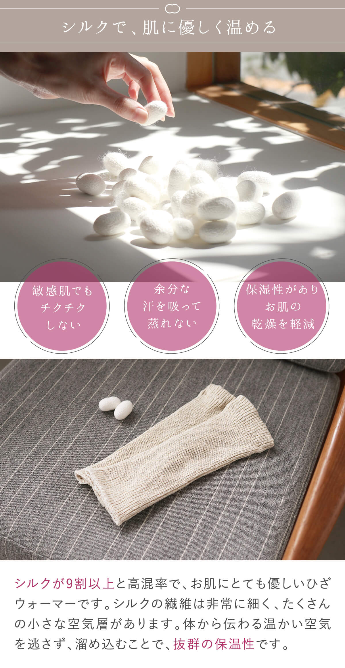 保温性、吸湿放湿性に優れたシルクで、蒸れずに心地よく膝を温めます。