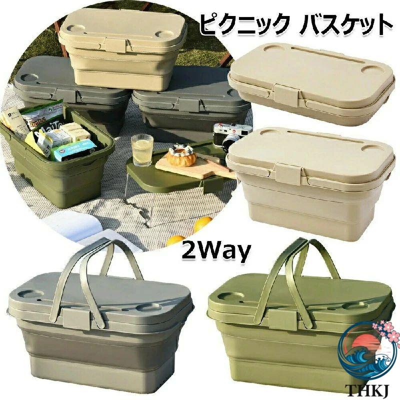 ピクニック バスケット 折りたたみ式 収納バスケット 蓋付き 2way キャンプ用 THKJ テーブル 多機能 アウトドア ポータブル 収納ケース 大容量 手提げかご