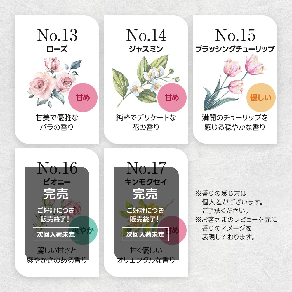 ・パッケージの印刷に滲みがあるものがありますが、品質、ご使用上の問題はありません。 ・商品の色、質感につきましては、ご利用されるモニター環境、またOSやブラウザのバージョンによっても画面上ご覧になっている色と、実際の商品の色が多少異なる場合がございます。 ・商品レビューは、あくまでも個人の感想であり、商品の効果や効能を確約・保証するものではありません。 ・アロマセラピーは医療ではございません。記載内容は、精油の効果効能、心身の不調改善を保証するものではありません。事故やトラブルに関しては責任を負いかねますので、安全に留意して自己責任でのご使用をお願い致します。 ・持病をお持ちの方、妊娠中の方、お子様に使用する場合や、その他使用に不安のある方は、専門家や専門医に相談することをお勧め致します。 |