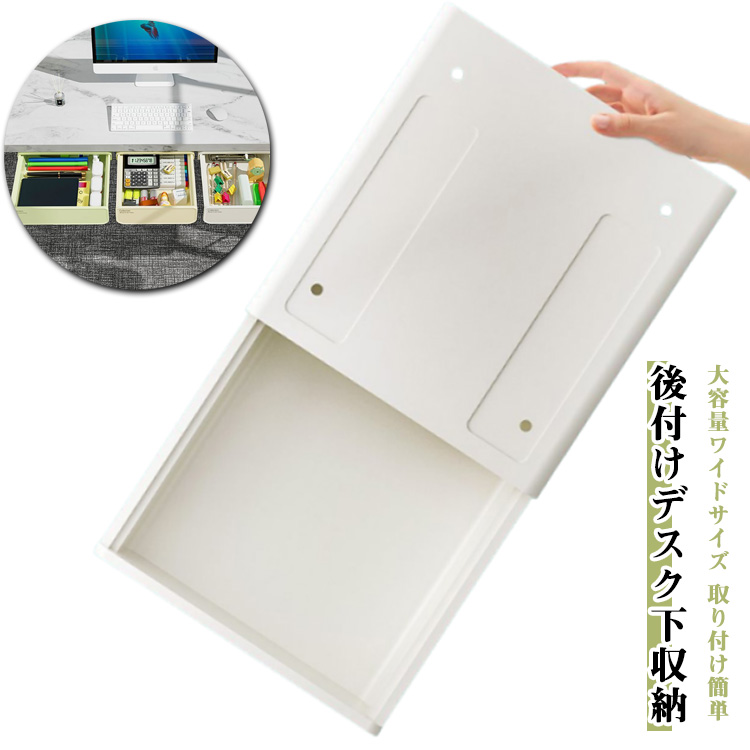 | 大容量ワイドサイズ 取り付け簡単 後付けデスク下収納 文房具や小物が散らかりがちなデスクまわりを天板下のデッドスペースを有効活用して整理整頓。 取り付けは付属の粘着シートで張り付けるだけでとっても簡単。 スリムな設計なので座って作業をするときにも邪魔にならずさっと引き出してすぐに取り出せるので作業効率も大幅にアップ。 オフィス用品はもちろん、キッチン小物やコスメやスキンケア用品など様々なアイテムを収納するのに大活躍します | |