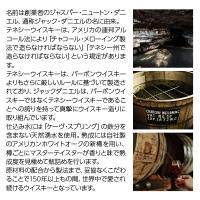 | オーク樽のほのかな風味。スムースでドライな後味。 バニラ、キャラメル等の良い香りとまろやかでバランスのとれた味わいが特長です。 熟成によるスパイシーな風味が調和した深みを生み出しています。 ミディアム・ヘヴィなボディで、華やかな香りとまろやかな味わいのテネシーウイスキーの代名詞といえる存在です。 |