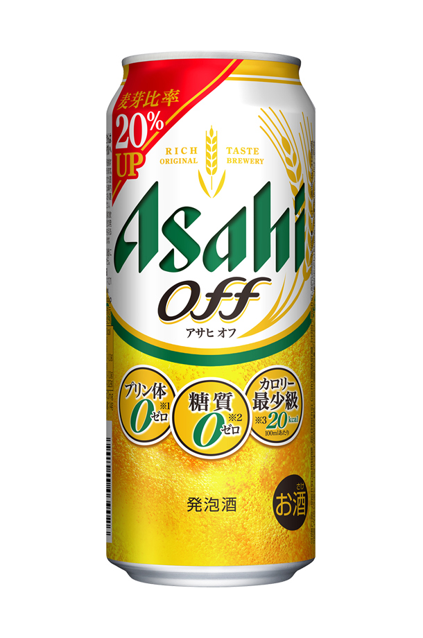アサヒ・オフは、プリン体ゼロ(※1)・糖質ゼロ(※2)・カロリー最少級(※3)を実現。麦芽比率を20%アップすることで、ビールらしい香りとコクを向上させました。体を気づかいながらビール類を楽しみたい方にぴったりなおいしいゼロの発泡酒です。