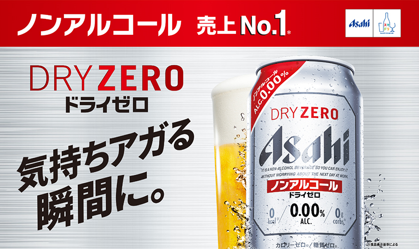 アサヒ ドライゼロは2012年2月の発売以来、ビールらしい味わいが好評で、ノンアルコールビールテイスト飲料市場において売上No.1(※)を達成。最もビールに近い味を目指したノンアルコールビールです。味にこだわりをもつビール類ユーザーが満足できるよう、“アルコール度数0.00%”でもビールならではの味わいとのどごしを再現できるよう独自の技術を開発しました。ビールを飲みたいけれど飲めなかった様々なシーンでも、ガツンとしたのどごしとキレで爽快な味わいが楽しめます。