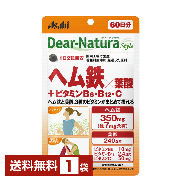 ヘム鉄×葉酸+ビタミンB6・B12・C 120粒(60日分) アサヒ ディアナチュラ スタイル 栄養機能食品 鉄 ヘム鉄350mg(鉄7mg含有) 葉酸240μg ビタミンB6 10mg ビタミンB12 2.4μg ビタミンC 50mg 着色料無添加 |