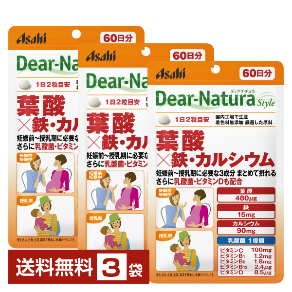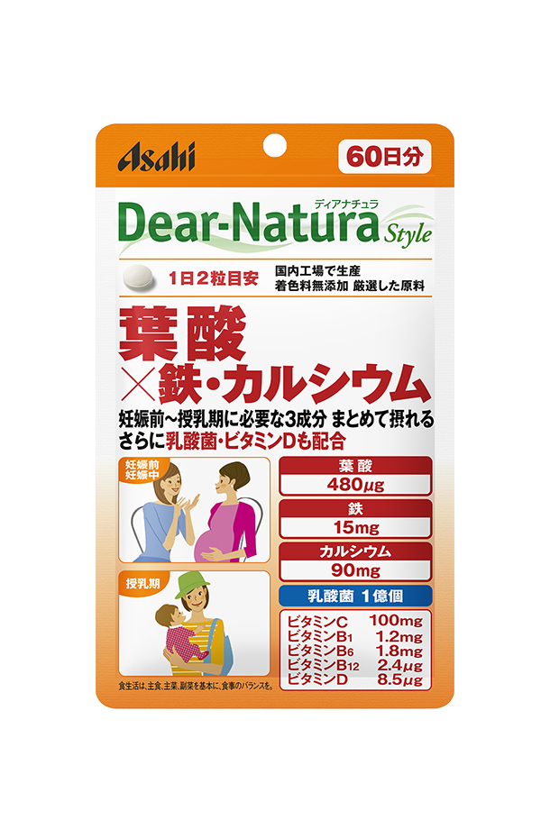 葉酸×鉄・カルシウム 120粒(60日分) アサヒ ディアナチュラ スタイル 葉酸480μg 鉄15mg カルシウム90mg 乳酸菌1億個 着色料無添加 |