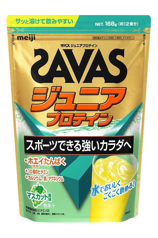 | ザバス ジュニア プロテイン マスカット風味は、スポーツジュニアが食事などで不足しがちな栄養素を理想的に補えるプロテインです。 スポーツできる強いカラダづくりと成長のために、たんぱく質は摂りたい成分の1つです。たんぱく原料として、高精製された純度の高い「ホエイプロテインアイソレート」を100%使用しています。 「10種のビタミン+カルシウム+鉄+マグネシウム」配合。食事・間食だけでは不足しがちな栄養素を理想的に補えるよう設計しています。 ※「ザバス ジュニアプロテイン」は、明治が実施したスポーツジュニアの食事調査結果に基づき、スポーツジュニアのカラダづくりに必要とされるビタミン、ミネラルを独自に設計して配合しています。 栄養機能食品(ビタミンD) ビタミンDは、腸管でのカルシウムの吸収を促進し、骨の形成を助ける栄養素です。 ※1日当たりの摂取目安量(28g)の栄養素等表示基準値(18歳以上、基準熱量2,200kcal)に占める割合:ビタミンD54% スポーツジュニアの風味調査を重ねて決定した、さわやかなマスカット風味です。運動後などすっきり飲みたいときに、水で溶かしておいしく召し上がれます。 アンチ・ドーピング認証「インフォームドチョイス」を取得。 |