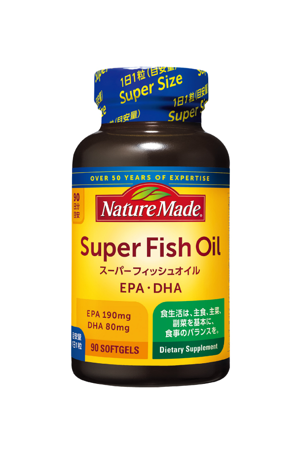 | 大塚製薬 ネイチャーメイド スーパーフィッシュオイルは、EPA・DHAのサプリメント。食事で摂りにくいEPA・DHAが1粒にギュッと270mg含有しています。 脂肪の摂り過ぎを気にしている方、魚が苦手な方、1日1粒でOKなタイプのサプリメントをお探しの方におすすめ。 ベースサプリメントと合わせて健康の土台を作る、プラスオンサプリメントです。栄養補給として1日1粒を目安に、必ず水やぬるま湯などでお飲みください。 EPA・DHAとは EPA及びDHAはオメガ3系(n-3系)脂肪酸で、イワシ、アジ、サンマ、サバ、マグロなど青魚に含まれています。n-3系脂肪酸は生体内で作ることができないため、生命を維持するために食事から摂取する必要がある必須脂肪酸となっています。 食生活は、主食、主菜、副菜を基本に、食事のバランスを。 その他特記事項 粒が大きいのでのどにつまらせないよう、ご注意ください。 開封後はキャップをしっかりしめてお早めにお召し上がりください。 多少白濁したり、カプセル同士がくっつく場合がありますが、品質に問題ありません。 ※アレルギー情報は、アーモンドを含む特定原材料等28品目で表示しています。 ※製品の切換えに伴い、お手元の製品パッケージの記載内容が本サイトの情報と異なる場合があります。 お召し上がりの際は、製品の表示をご確認ください。ご不明なことがございましたら、メーカー等にお問い合わせください。 |