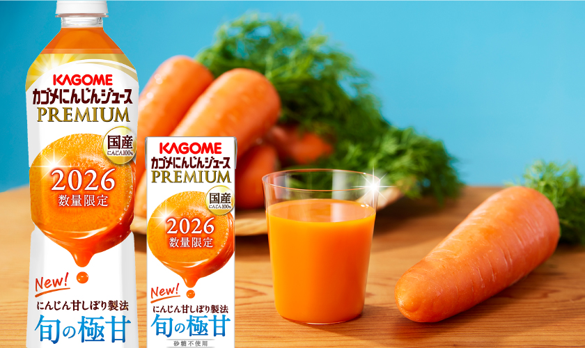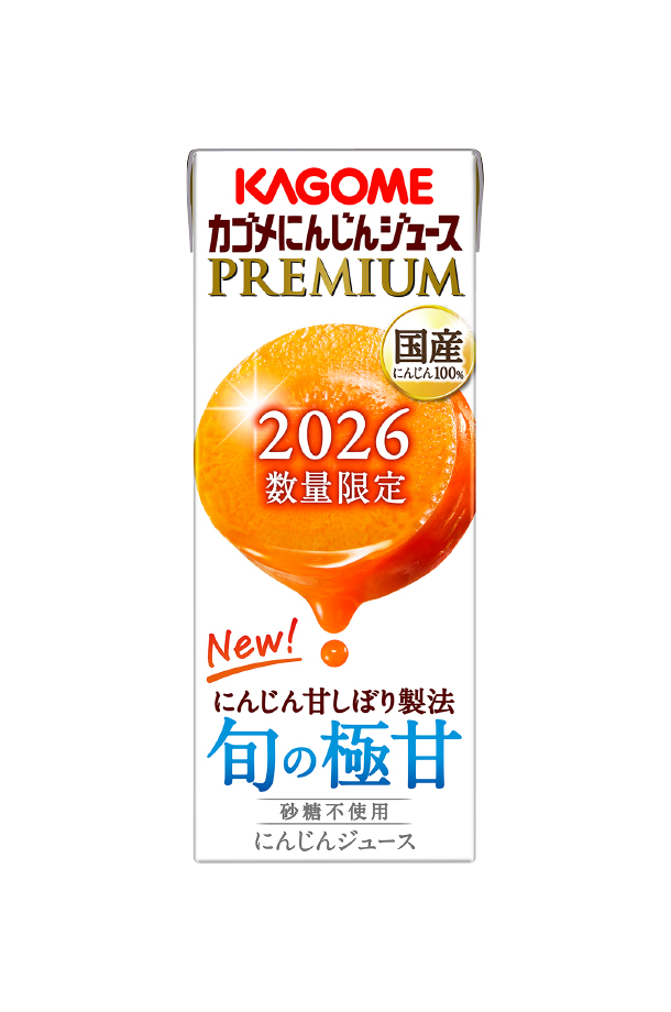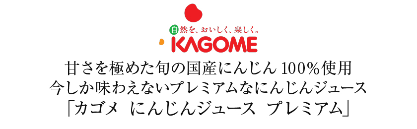 | 「カゴメ にんじんジュース プレミアム」は、カゴメ独自の新製法である“にんじん甘しぼり製法”により、にんじん本来の甘さを極めた驚きの味わいが楽しめる数量限定のジュース。 甘みと栄養を蓄えた旬の国産にんじんを100%使用。国産にんじん以外何も加えていない素材本来の甘さが楽しめるプレミアムにんじんジュースです。 |