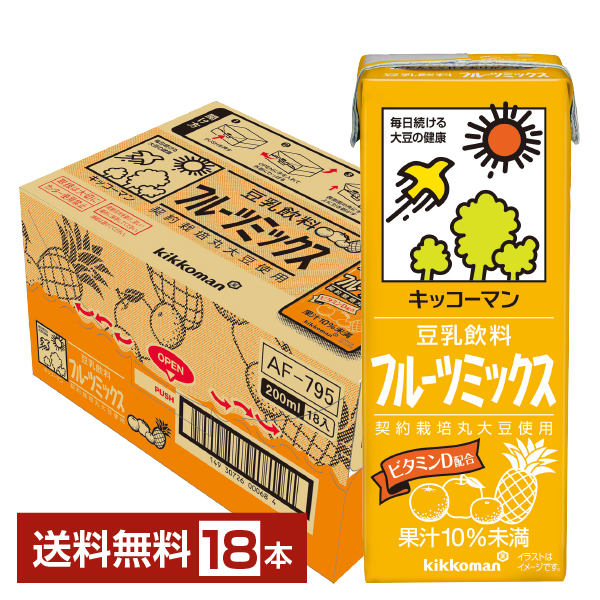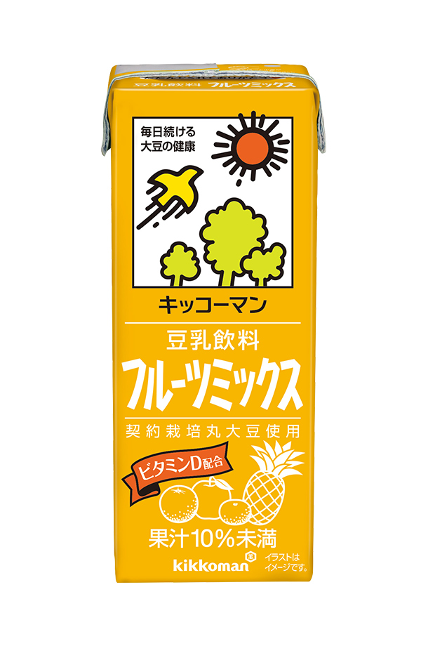 | キッコーマン 豆乳飲料 フルーツミックスは、契約栽培丸大豆を使用。 りんご、パイナップル、オレンジ、みかんの果汁をブレンドしたフルーティーな味わいで、お子さまにもおすすめの豆乳です。 カルシウムの吸収を促進するビタミンD(2.5μg)を配合。 |