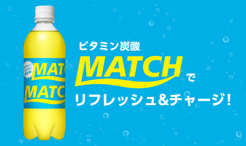 マッチは、「ゴクゴク飲める炭酸飲料」をコンセプトに開発され1996年に誕生した、爽やかな味わいと微炭酸で飲みやすい、ビタミンとミネラルがおいしくとれるビタミン炭酸飲料です。