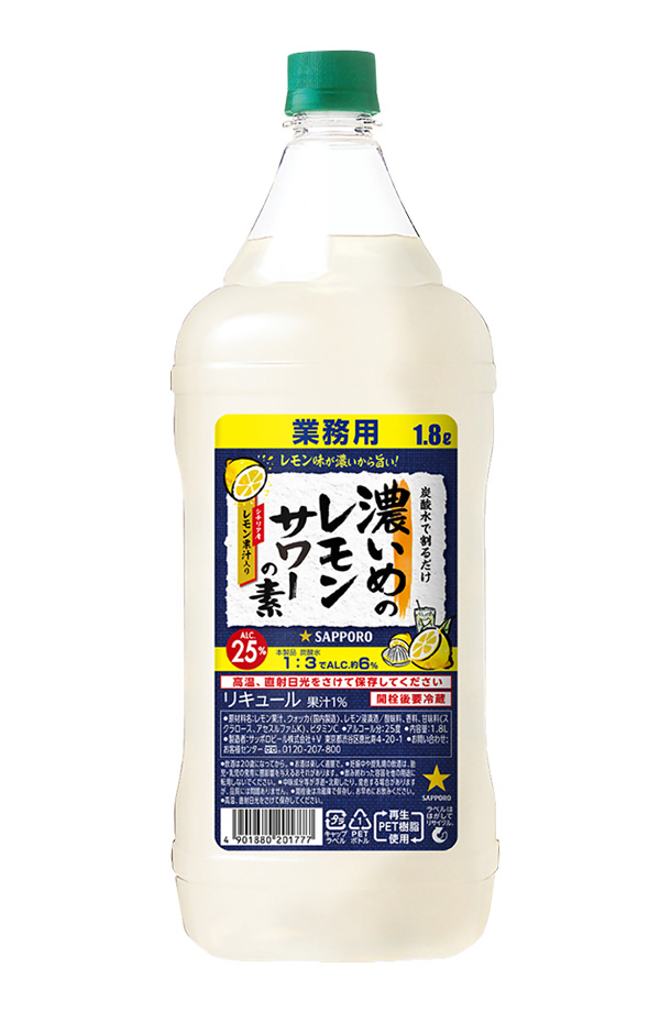 | サッポロ 濃いめのレモンサワーの素は、レモンにこだわった、レモン味が濃いめのレモンサワーの素です。 シチリア産の手摘みレモン果汁を使用し、レモンの爽やかな香りと、しっかりとしたすっぱさが特長です。 炭酸水を注ぐだけで、爽快感あふれる香りで口当たりの良い酸味が特徴の、濃いめのレモンサワーが完成します。 お好きな時にお好きな割り方でお楽しみください。 |