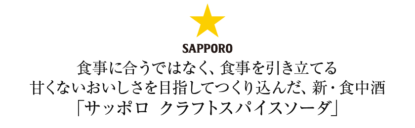 サッポロ クラフトスパイスソーダは、“食事に合う”ではなく、“食事を引き立てる”甘くないおいしさを目指してつくり込んだ、新・食中酒です。