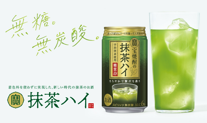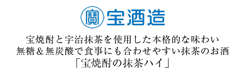 宝焼酎の抹茶ハイは、ベースとなるアルコールには抹茶の風味を引き立てる厳選した宝焼酎と、茶葉には京都の宇治抹茶を使用した本格的な味わいの抹茶のお酒です。